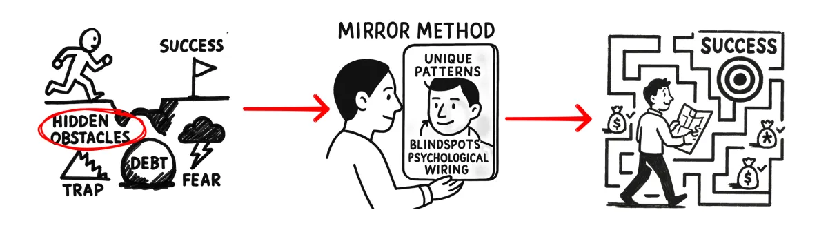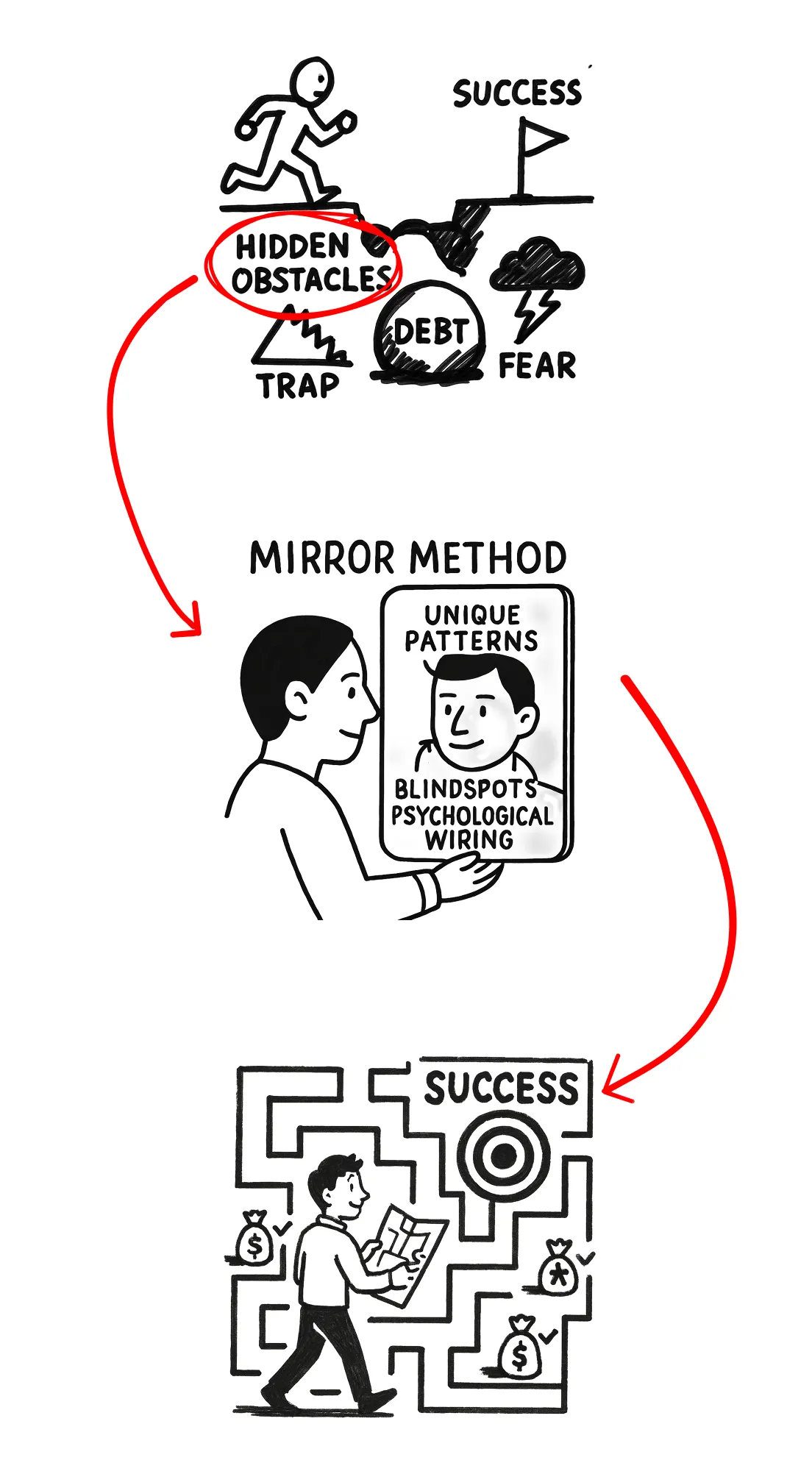 This works by using something we call "The Mirror Method" — a revolutionary approach that reflects your unique patterns, blind spots, and psychological wiring back to you using AI...